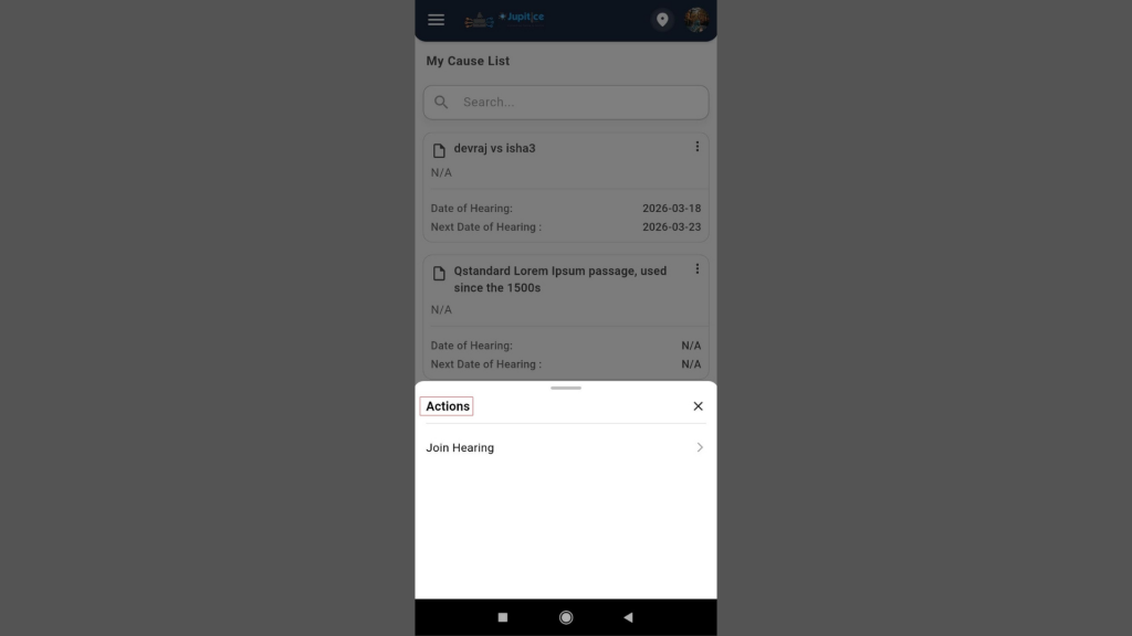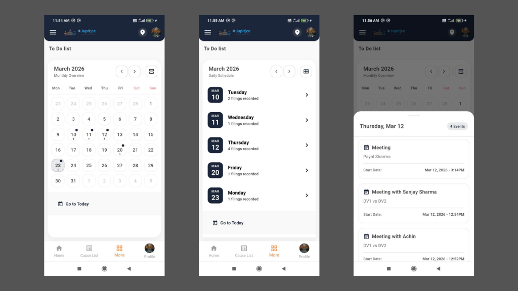 We have introduced the Custom Calendar Widget feature, which provides a centralized and user-friendly way to manage all case-related activities, including court hearings, meetings, consultations, and legal notices, through a calendar-based interface in our mobile application. Users can easily access the calendar from the “More” section, where they will see a monthly view that highlights important dates with scheduled events. The feature allows for seamless navigation between months, includes a toggle between monthly and daily views, and offers a “Go to Today” option for quickly focusing on the current date. When a specific date is selected, it is highlighted, and an event indicator displays the number of scheduled activities for that date. Tapping on a date opens a detailed event list panel that includes key information such as the event type, participant or party name, and start date and time. This enhancement enables users to efficiently track their schedules and quickly navigate to relevant case details, ultimately improving productivity and organization.