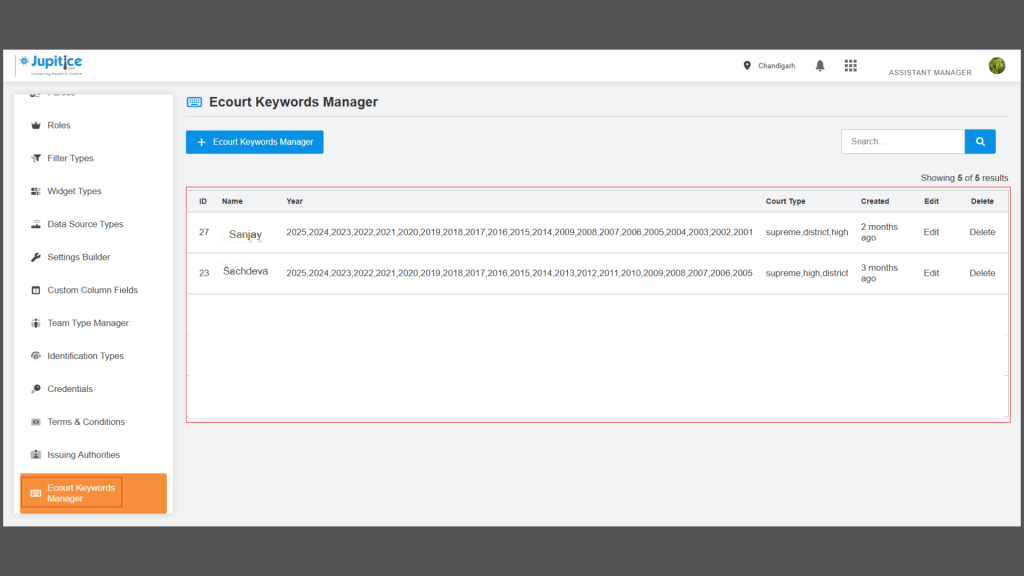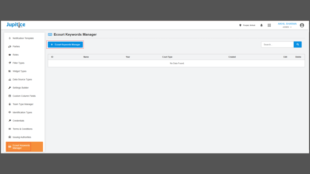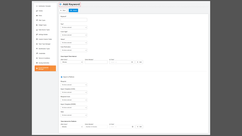 We have enhanced the Keyword Manager Settings to enable a more dynamic, user-driven approach to fetching and managing E-Court case data directly from the frontend. With this update, users can configure keywords with advanced controls, including status (enabled/disabled), customizable time intervals for automated fetching, and multi-select case particulars such as case details, orders, and cause lists. A newly introduced RUN button allows users to initiate the fetch process instantly, with real-time feedback via statuses such as “Job Initiated” and “Job in Process,” and a dedicated RUN STATUS column for visibility. Additionally, users can opt to import fetched cases directly into the platform by configuring blueprints, events, and templates, ensuring seamless case filing aligned with predefined mappings. The enhancement also includes detailed audit information, such as creation/last update timestamps, user details, and edit history, to improve tracking and transparency. Overall, this upgrade eliminates manual backend dependencies, introduces automation with flexible scheduling, and significantly improves efficiency and control over case data workflows.