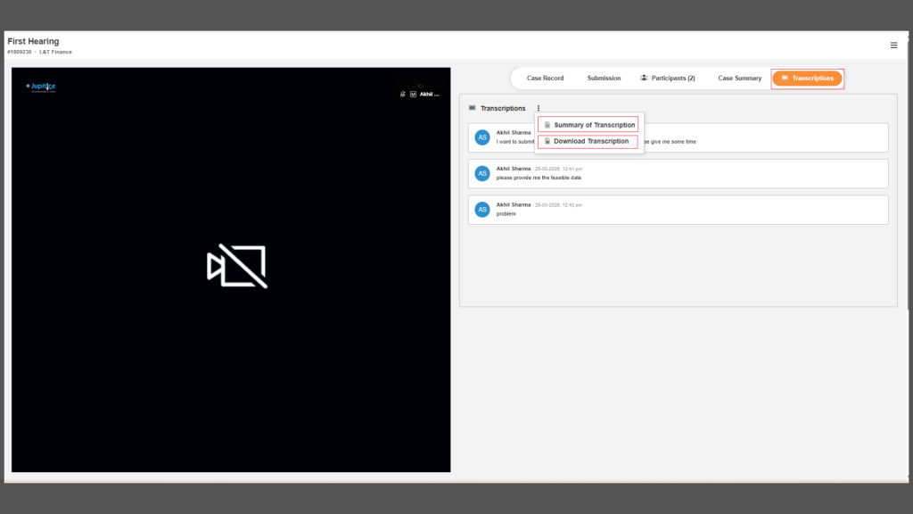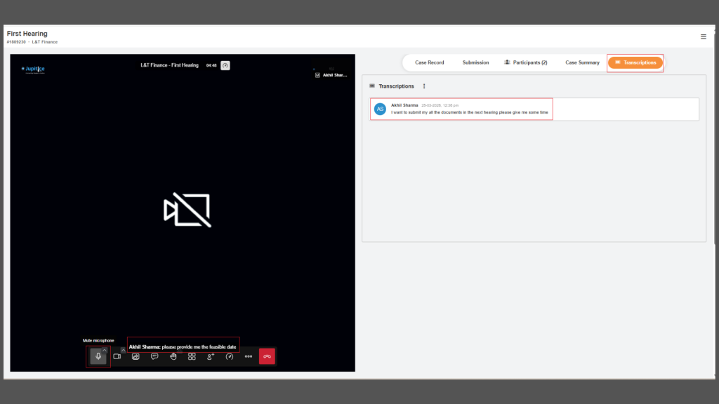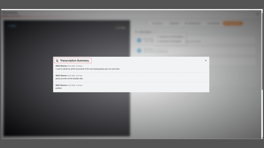 We have successfully implemented a real-time transcription feature with on-screen subtitles to enhance the overall hearing room experience. During each session, our system actively captures audio and converts spoken conversations into accurate, real-time text that is displayed instantly as subtitles. These subtitles update continuously as participants speak, ensuring a seamless and easy-to-follow experience even in situations with poor audio quality or varying accents. We have also integrated speaker identification, allowing users to see who is speaking alongside the transcribed text, which adds clarity and context to the discussion. Once the hearing concludes, the complete transcript is automatically saved for future reference, supporting transparency and record-keeping. Additionally, we have provided a simple configuration option to toggle the transcription feature on or off, giving users full control over their experience while maintaining flexibility and ease of use.