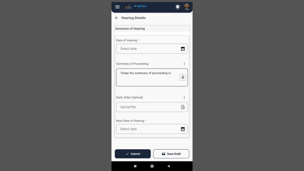 We have developed the Cause List – Manual (Create/Preview) feature to streamline the management and recording of hearing details in the system. Through this module, users can access the Cause List section from the main menu to view a list of scheduled hearings, each displaying essential information such as the Case Title, Date of Hearing, Next Date of Hearing, and a View action button. By clicking the View option, users are redirected to the Hearing Detail Page, where they can review complete information related to a specific hearing. The module also allows users to create a new hearing by selecting the Create New Hearing option, which opens a form where details such as the Date of Hearing and Summary of Proceedings can be entered, with the flexibility to add additional information fields using the “+” button if required. Users can then upload the Daily Order document and select the Next Date of Hearing. After entering all the necessary details, the Save & Next option takes the user to a Preview Page where all information can be reviewed before final submission. If any changes are needed, users can edit the details and proceed to submit the record. Once submitted, the hearing information is securely saved and automatically updated in the Cause List section, allowing users to access detailed hearing information at any time via the View option.