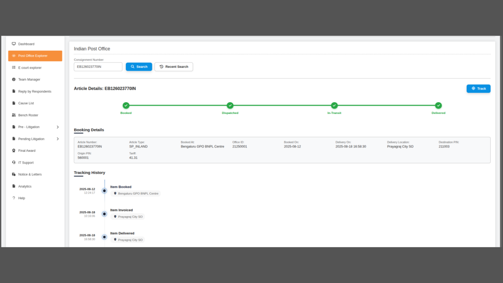 We have implemented the India Post Explorer widget in the widget type section of reports to simplify tracking and retrieving consignment proof details, such as dispatch and delivery. Users can enter a consignment number and click Search to view results, while the Article Details section remains blank until a search is performed. A Recent Search feature allows users to view past searches in a pop-up with key details for quick access. The Article Details section displays tracking information in a structured format and includes a track button in the top-right corner. On clicking, the consignment ID is saved and continuously monitored via API; if already tracked, the button shows “Tracked” and does not re-trigger tracking. Additionally, the article’s details page is accessible via a dedicated URL, enabling easy access from anywhere.