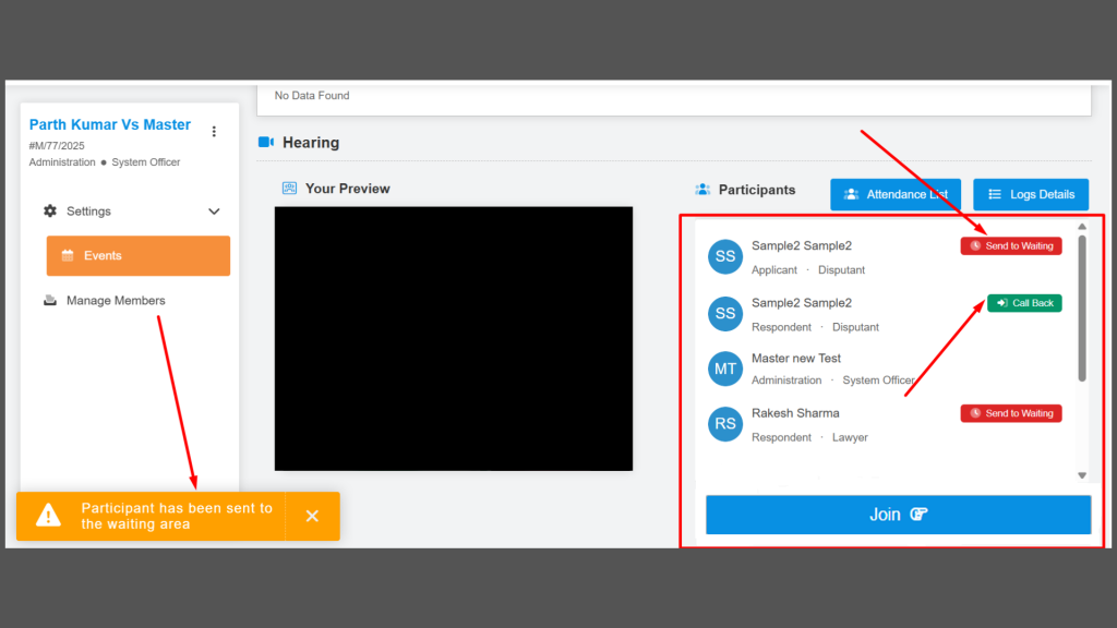 We have added a feature that enables the hearing host to efficiently manage participants by moving them between the hearing room and a waiting room or lobby without disrupting ongoing proceedings. During an active session, the host can view the complete participant list, select any individual, and instantly transfer them to the waiting area or bring them back into the hearing room as needed. This enhances control over attendance and helps maintain the decorum of the session. The feature is permission-based, allowing only authorized users such as the hearing host or admin to perform these actions, with all changes reflected in real time. Additionally, we have introduced a configurable setting to enable or disable this functionality per organisational requirements.