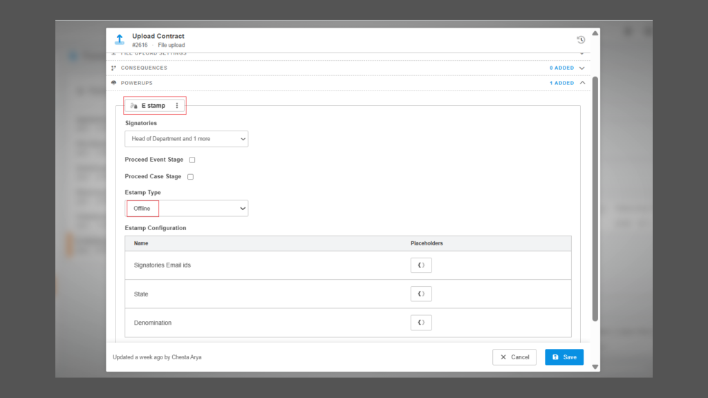 We have added a new Powerup Type called “E-Stamp” in form fields to support seamless e-stamping within the platform. With this enhancement, users can now select “E-Stamp” from the Powerup Type dropdown, and once selected, clicking “+ Add Powerup” opens a configuration panel where users can set the required e-stamp details. The interface is designed similarly to the existing E-Sign Powerup, making it familiar and easy to use, while also including additional fields required for e-stamp configuration. This update helps users configure and manage e-stamping directly within forms, streamlining and improving the overall document preparation process.